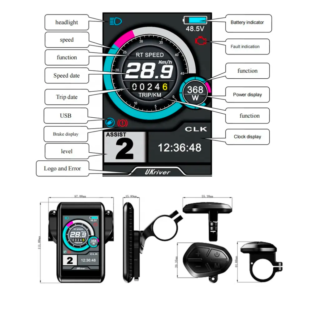 Displays speed, battery level, assist mode & distance